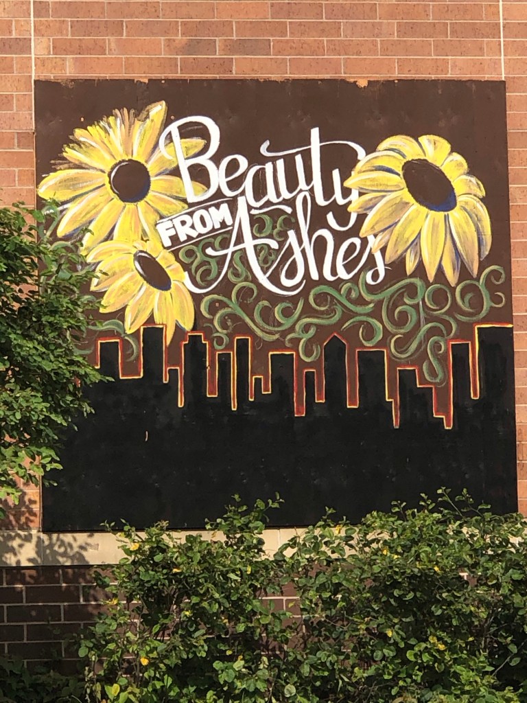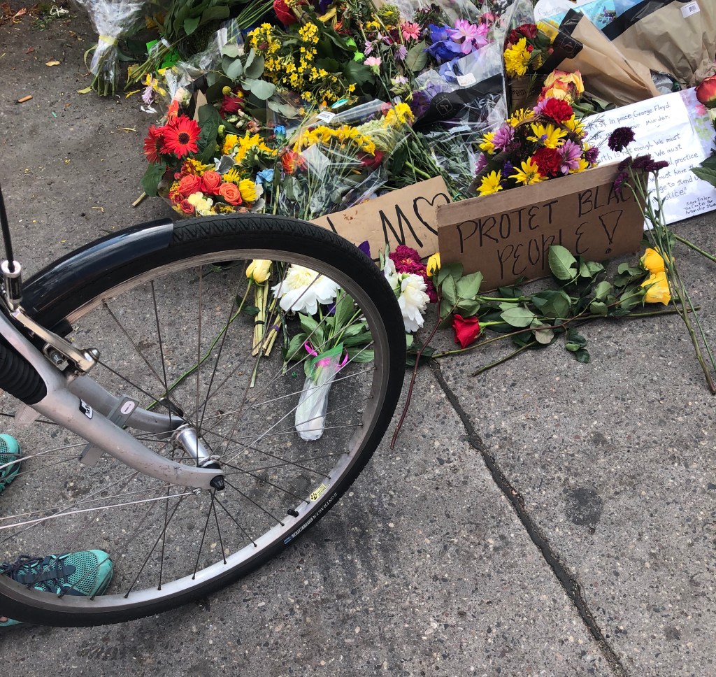 Today we went to sense. In the aftermath of the destruction, we saw people there like ourselves. Curious of the occurrences of the last weeks yet taking steps and exercising faith. I took a few photos. I stepped a little too close to torched businesses left with barely any structure or framework. We walked by a deer who wandered into a cemetery -maybe a little like many of us. We cheered for people volunteering, showing unison. We made a turn and found the peacefulness of Powderhorn Park. We continued walking to the corner grocery, the Cup Foods where George Floyd’s memorial stands and crowds gathered. We read names and signs, left flowers, and took breath with others.